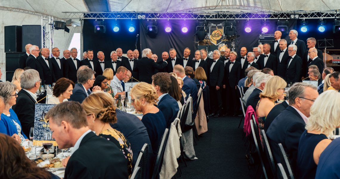 Drøyt 500 gjester fikk servert indrefilet av okse og pannacotta fra Grand Hotell, servert av syngende menn fra Egersund Mandsangforening. Jon Almås stilte som konferansier nok en gang slik han også gjorde den gang vi feiret vårt 50års jubileum.