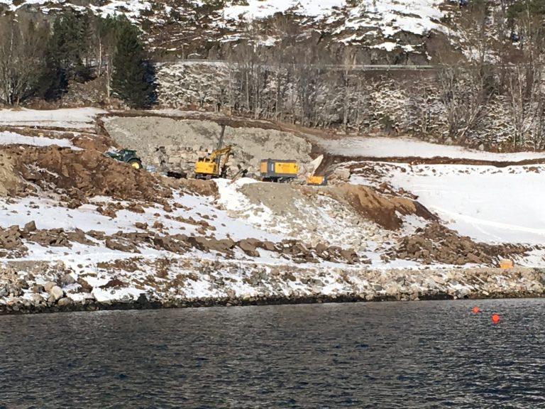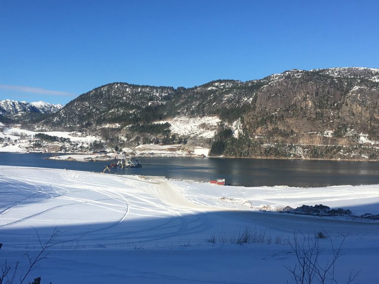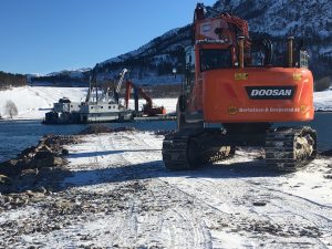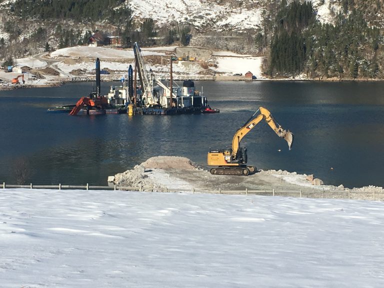 Metrostav er godt i gang med grunnarbeid for fundamenter i sjøen, og fundamentering av bro på land.