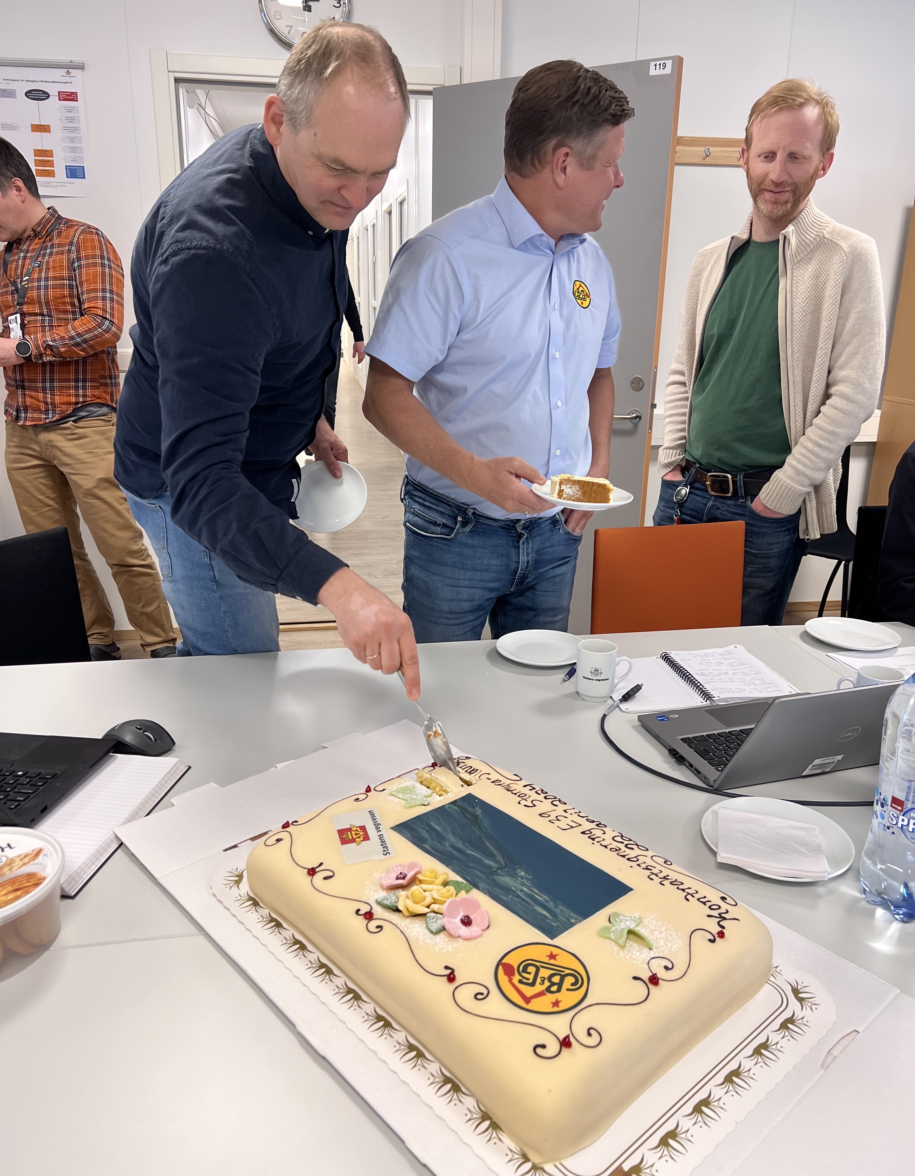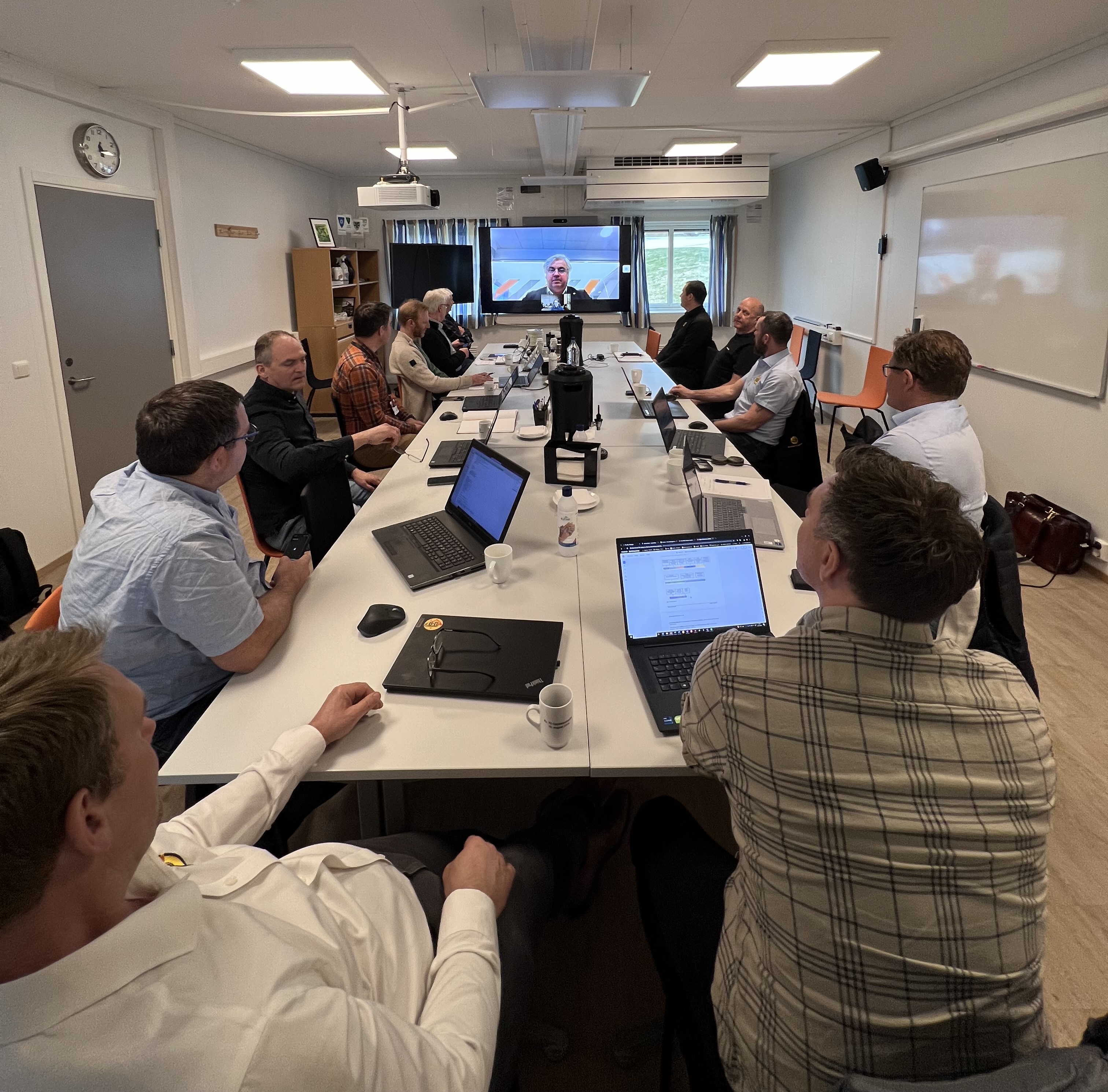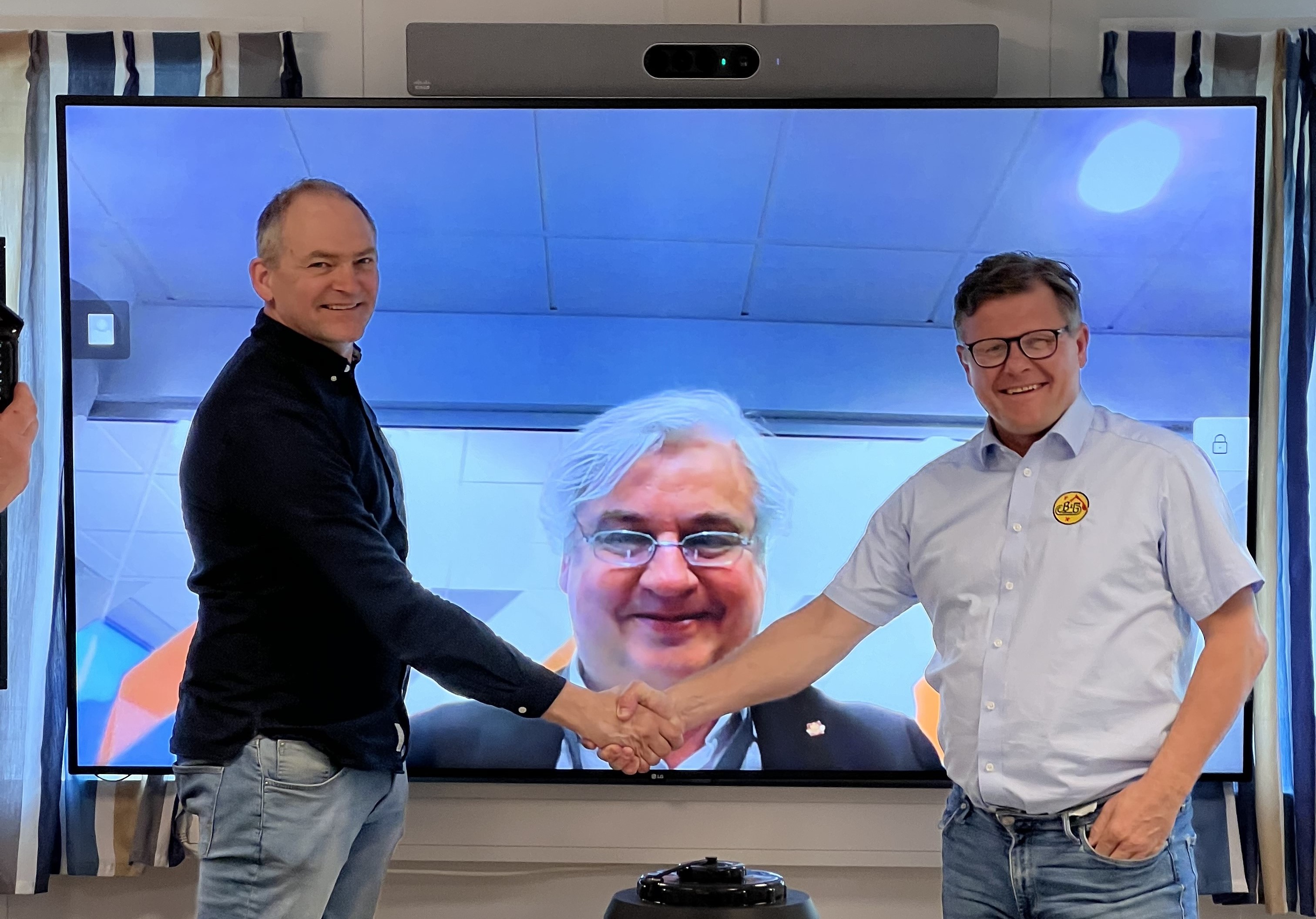 Prosjektdirektør i Statens vegvesen, Ove Nesje og daglig leder i Bertelsen & Garpestad, Geir Nesland Nilsen håndhilser foran utbyggingsdirektør i Statens vegvesen, Kjell Inge Davik som var med på Teams.